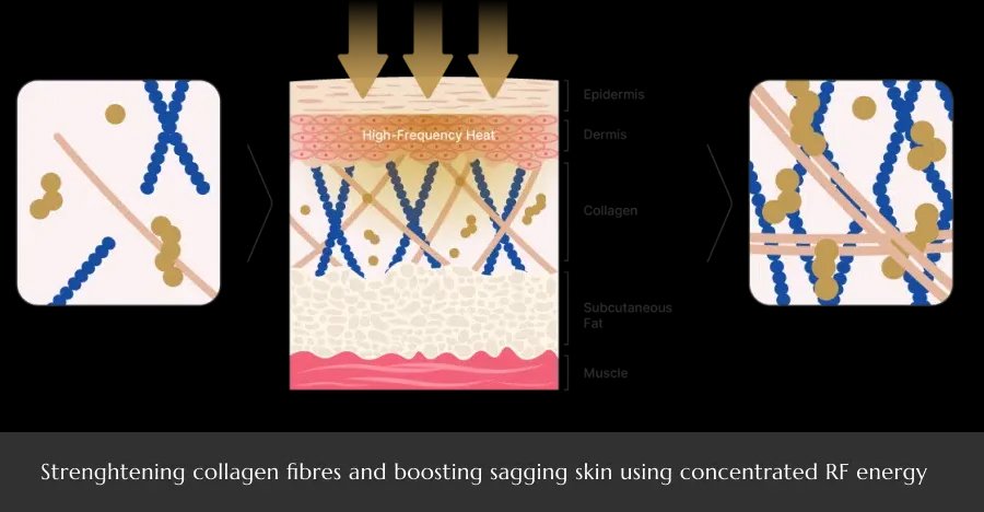 It delivers targeted RF energy to the deeper layers of the skin then stimulates collagen production, tightening skin and reducing wrinkles, sagging, and uneven texture, improving skin elasticity and firmness.